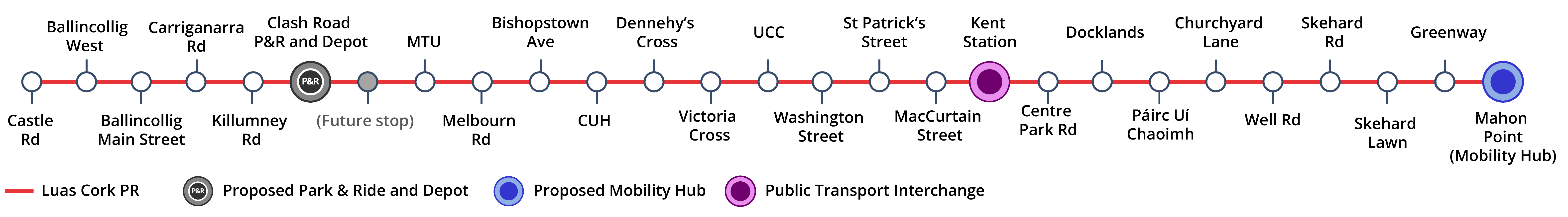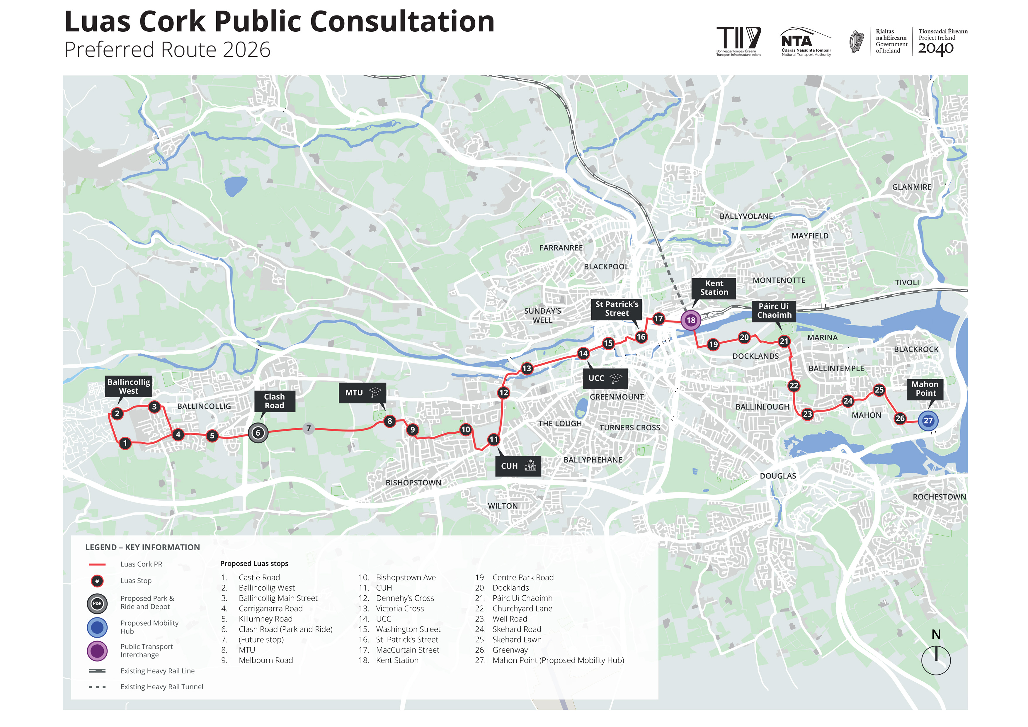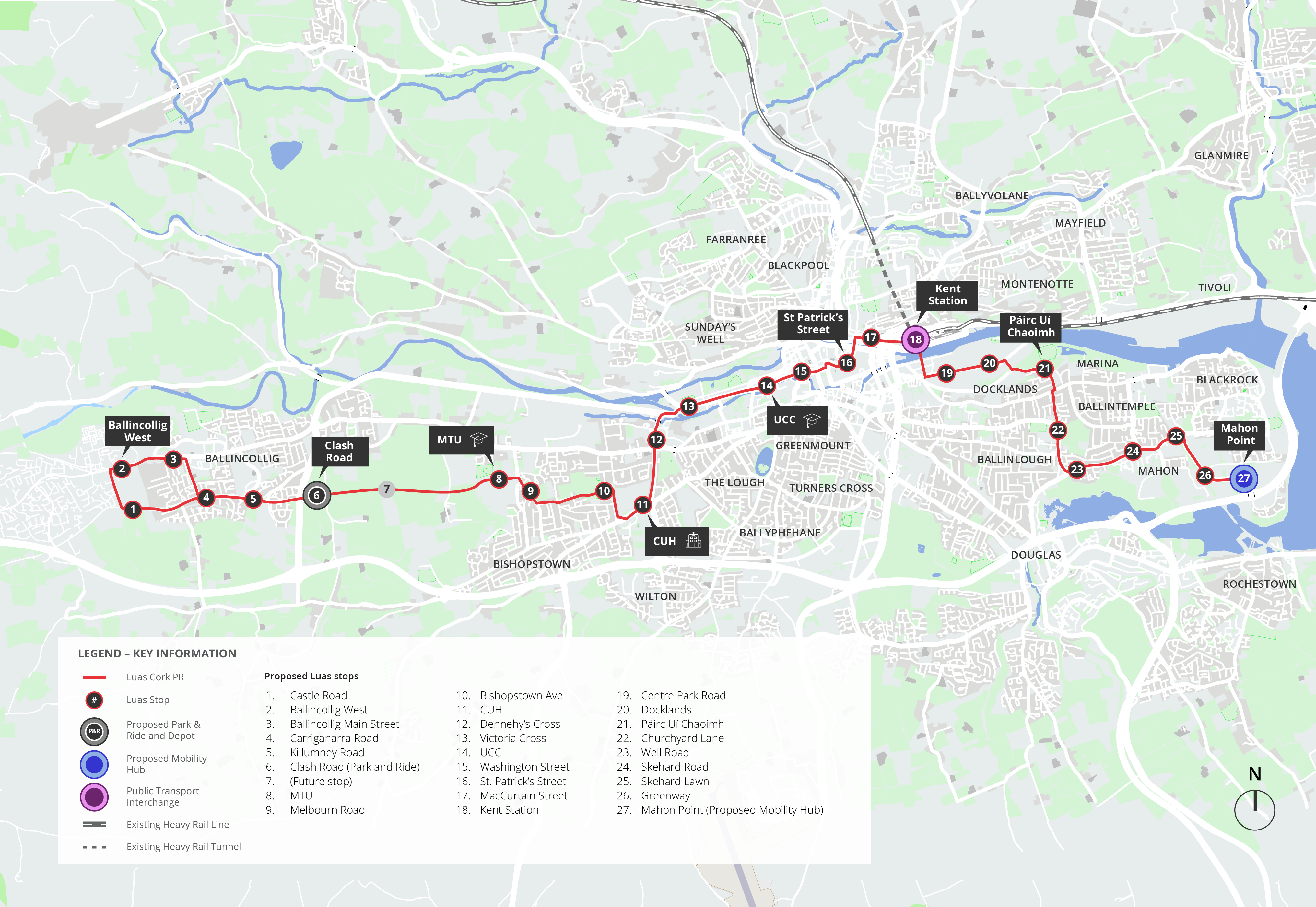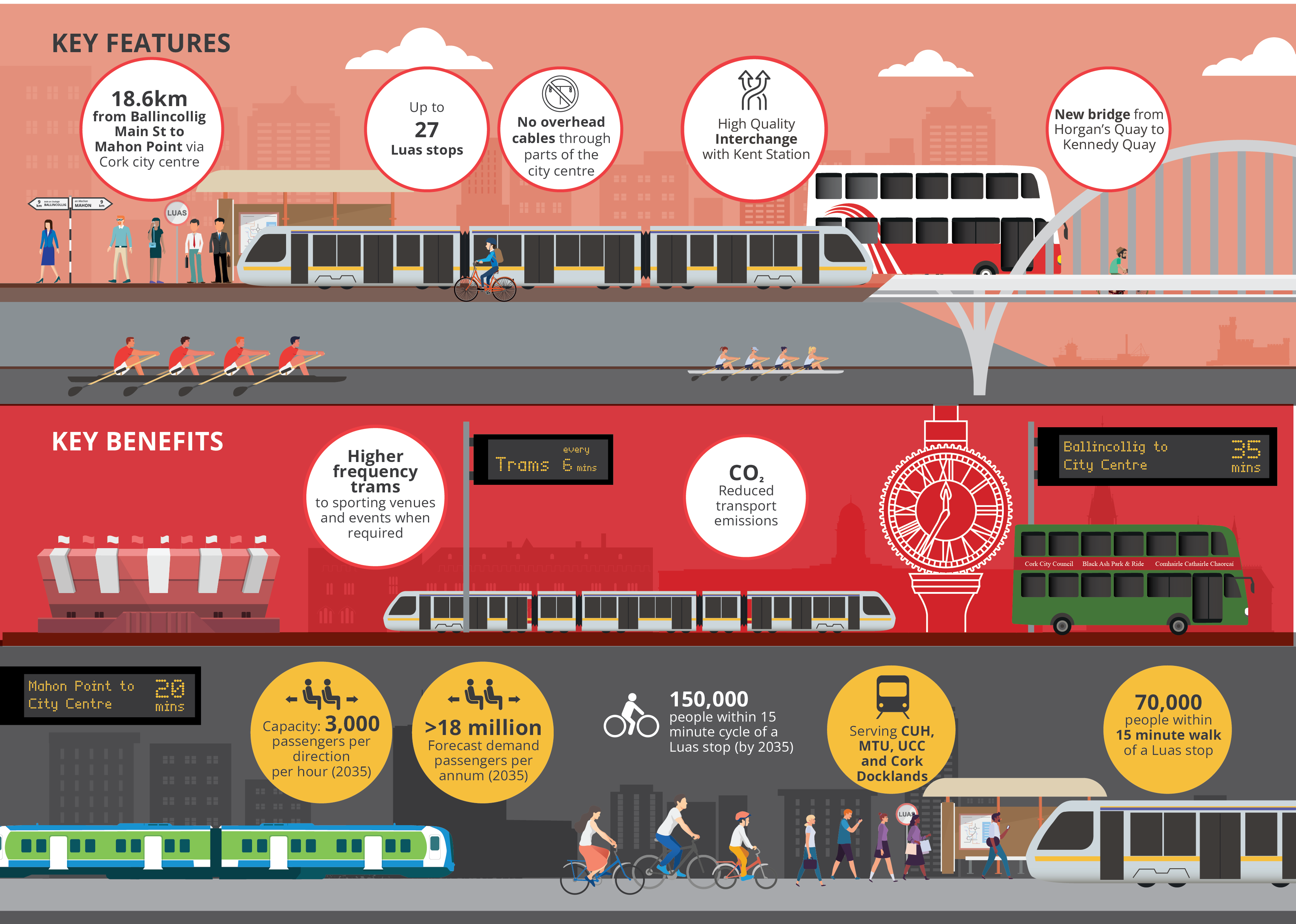Luas Cork will transform Cork city, creating a liveable, walkable, pleasant city. It is a proposed light rail line running from Ballincollig to Mahon Point, connecting communities and key destinations such as Munster Technological University, Cork University Hospital, University College Cork, the city centre, Kent Station, the Docklands, Páirc Uí Chaoimh, Blackrock and Mahon.