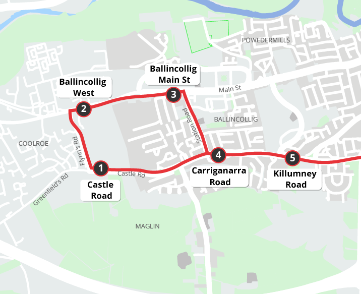 The proposed Preferred Route starts in Ballincollig. In a change from the EPR it begins at the Carriganarra Road/Station Road junction in a single-track loop running on to Castle Road, Flynn’s Road, Ballincollig Main Street (Main Road/ Carrigrohane Road) before turning southwards onto Station Road. Here the loop is complete, and the line continues eastwards in a more typical double-track arrangement.