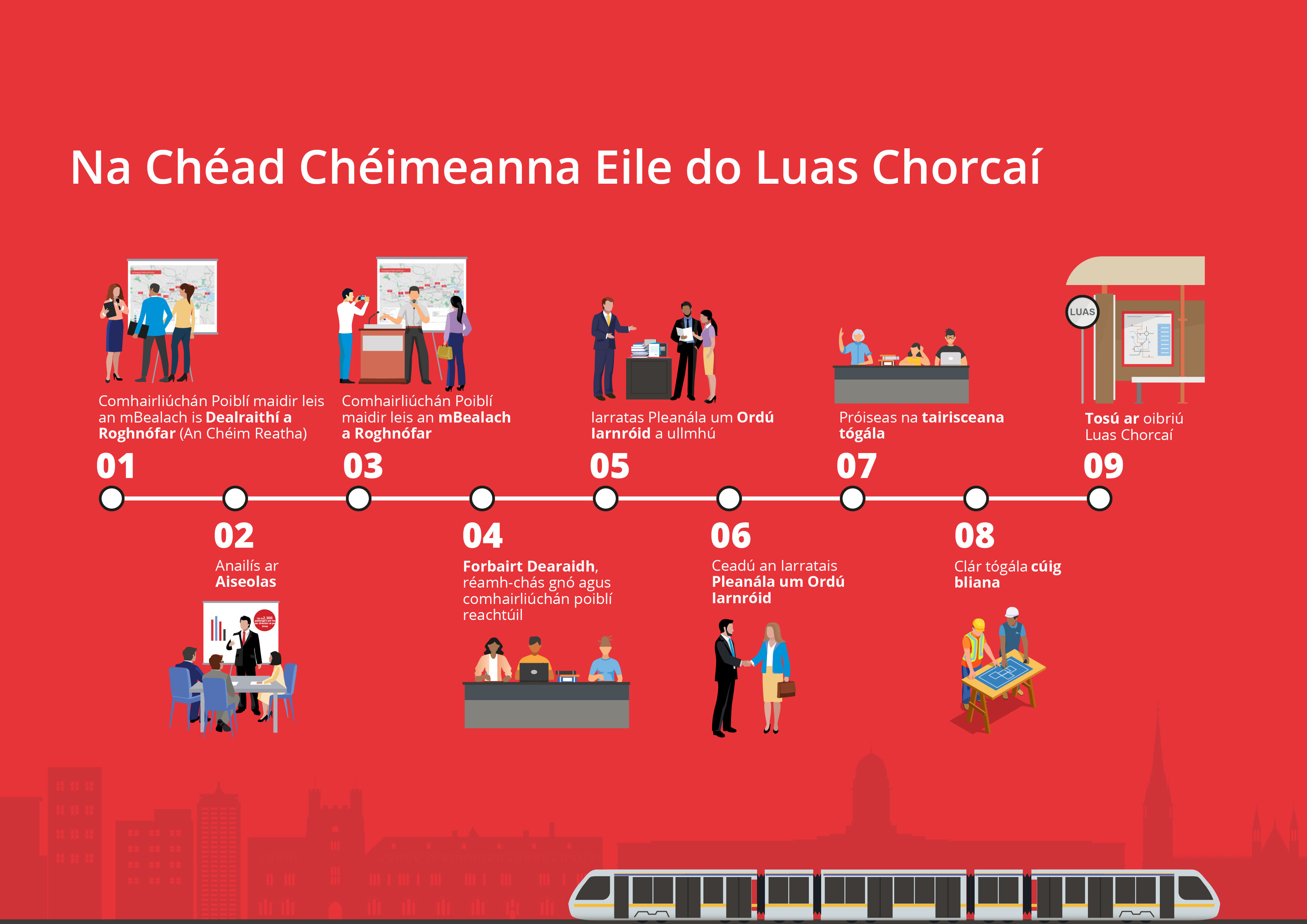Tá an tréimhse comhairliúchán don mBealach is Dealraithí a Roghnófar do Luas Chorcaí dúnta anois. Buíochas le cách a d’fhreastail ar ár Laethanta Oscailte Poiblí agus a chuir aighneacht isteach. Faoi láthair, táimíd ag súil siar agus ag déanamh anailís ar gach aiseolas atá faighte againn. Beidh coimre den príomh-torthaí agus na chéad céimeanna eile atá molta ar fáil in am trátha.